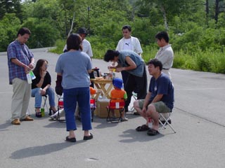 | クルマを並べなおして、あとは適当におしゃべり&まったりタイムとなりました。 お互いにクルマを交換して試乗したり、おのおの好みのアングルから写真とりまくったり、ステレオや内装,パーツの話などなど。 各自それぞれお楽しみ頂けたようです。 周りからはとにかく注目集まりまくりだったようです。 反省点としては、「日差しを避ける場所が無かったこと」「飲み物提供の準備をしていなかったこと」でしょうか。 でも、「たこやき屋さん」とそのかわいい売り子さんたちに救われました。 |